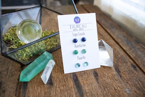 Set de boucles d';oreilles astrologiques: signe *TAUREAU* (pierre: Lapis lazuli, fluorite et aventurine) Chaque signe...
