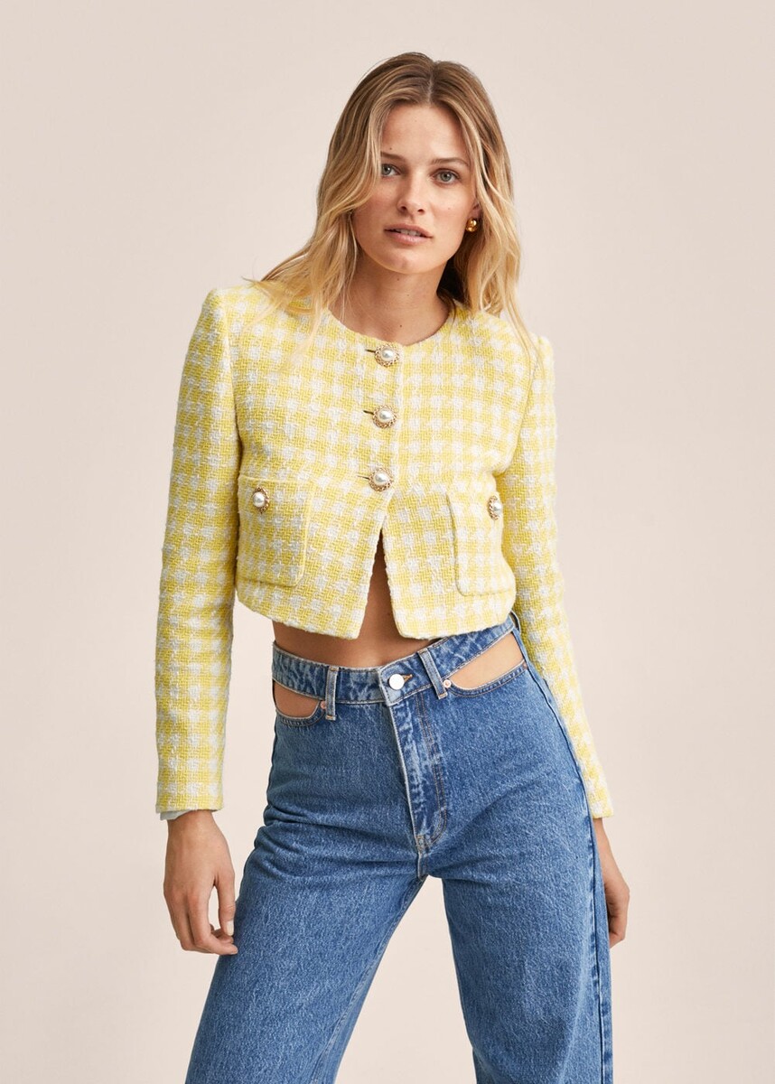 Tissu tweed Tissu de coton mélangé Imprimé carreaux Coupe droite Style crop Col rond Manches longues Épaulettes Deux ...